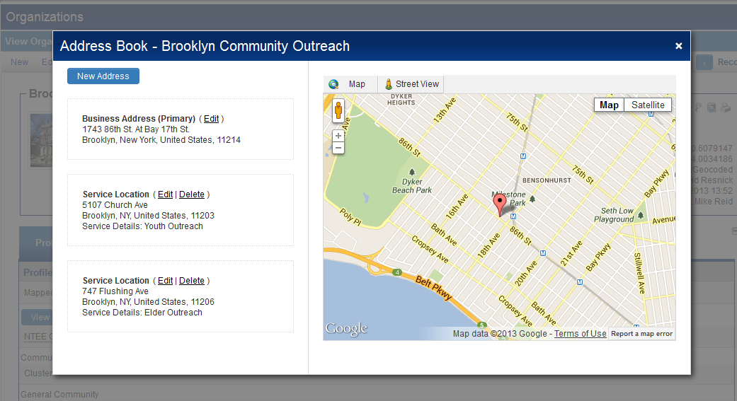Say that you wish to visit a person or organization in your system's address book. SmartSimple's integration with Google Maps will now give you a clear snapshot of their location. When you click on the address of a contact or organization in your system, a nifty little window will appear with that address on Google Maps.